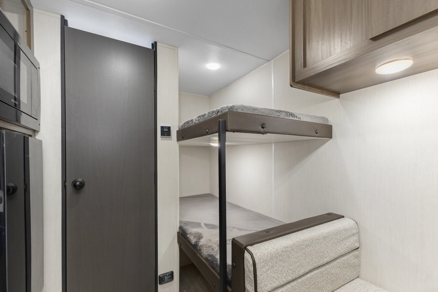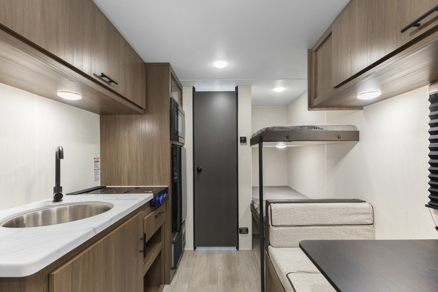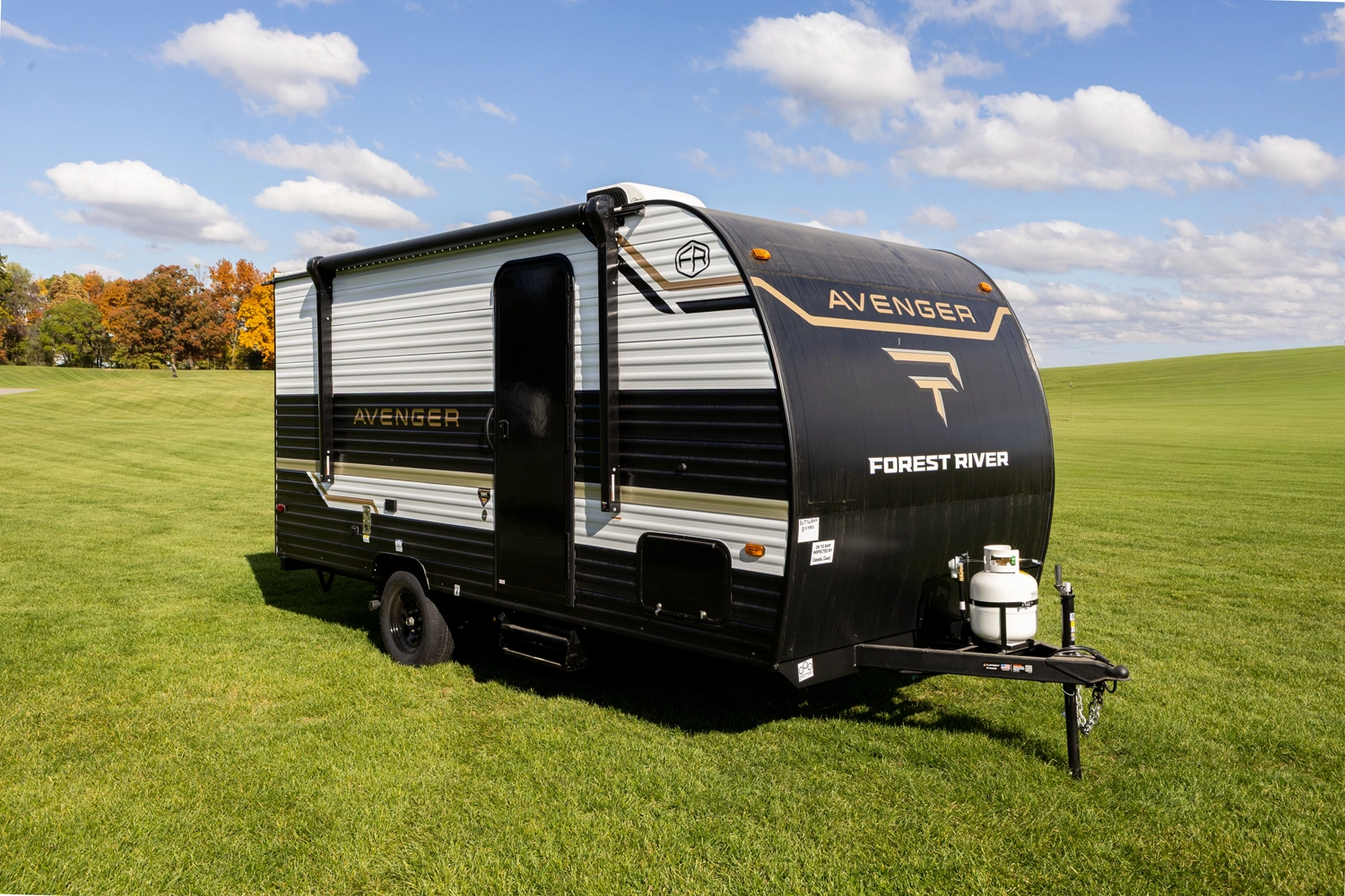 Looking for a lightweight travel trailer that's perfect for families? The Avenger 16BHX by Forest River makes great use of a 20ft 4in length with the ability to sleep up to five people! The Camp queen bed features a nightstand and nearby is a dinette that converts into an extra bed. The modern kitchen features a refrigerator, large stainless-steel sink, two-burner stovetop and a microwave. Near the rear bunk beds is a bathroom with a shower and toilet inside.