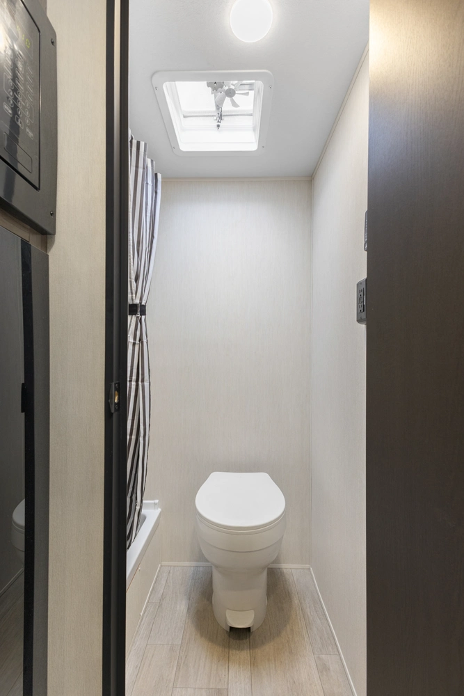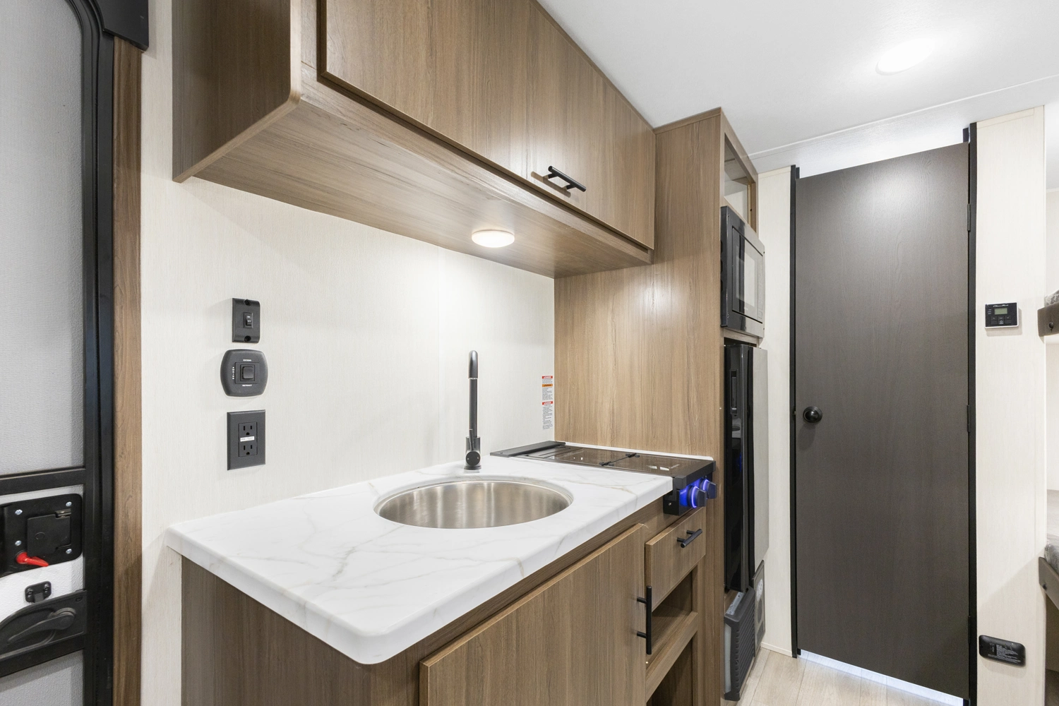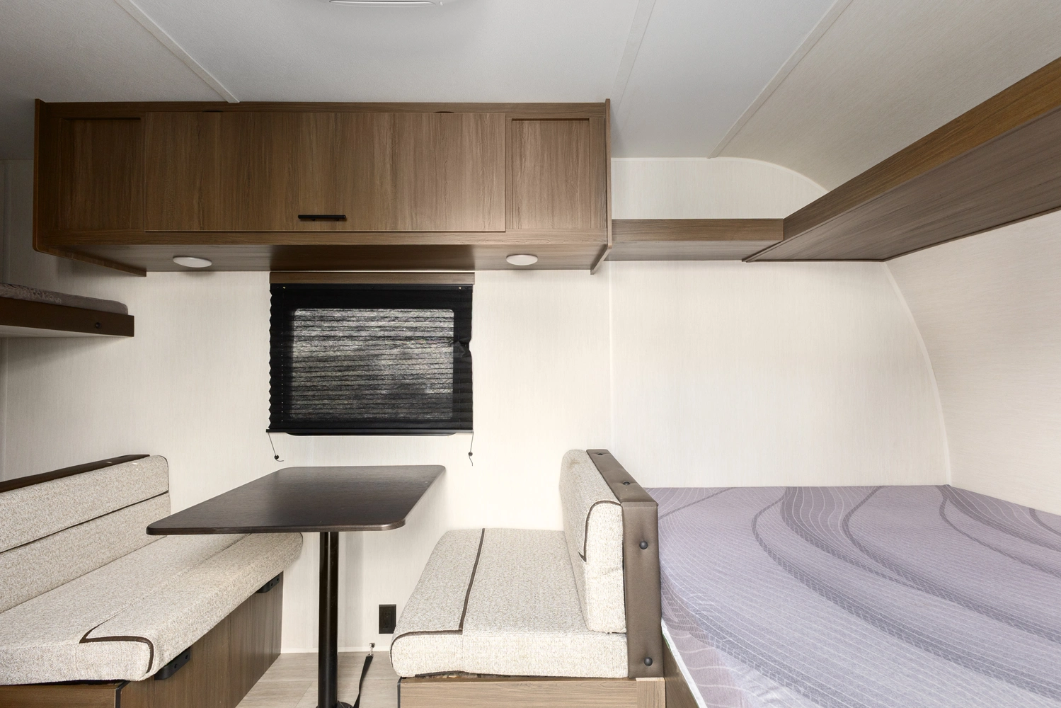 Looking for a lightweight travel trailer that's perfect for families? The Avenger 16BHX by Forest River makes great use of a 20ft 4in length with the ability to sleep up to five people! The Camp queen bed features a nightstand and nearby is a dinette that converts into an extra bed. The modern kitchen features a refrigerator, large stainless-steel sink, two-burner stovetop and a microwave. Near the rear bunk beds is a bathroom with a shower and toilet inside.