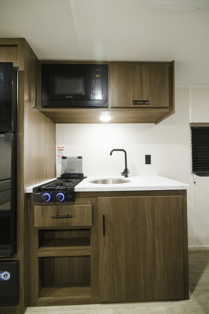 Looking for a lightweight RV perfect for solo travelers and couples? The Avenger 16RBX by Forest River is ideal with a simple, yet spacious design! Enjoy a front Walkaround, Camp queen bed with plenty of wardrobe space. Also nearby is a dinette that converts into an extra bed. The modern kitchen features a refrigerator, Large Stainless-Steel sink, two-burner stovetop, pantry and a microwave. In the rear is a full bathroom with plenty of linen storage.