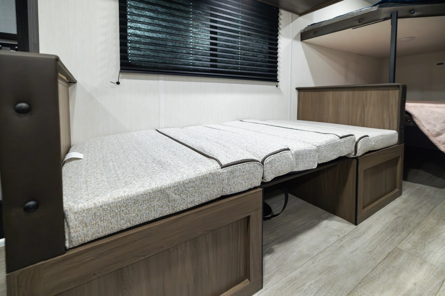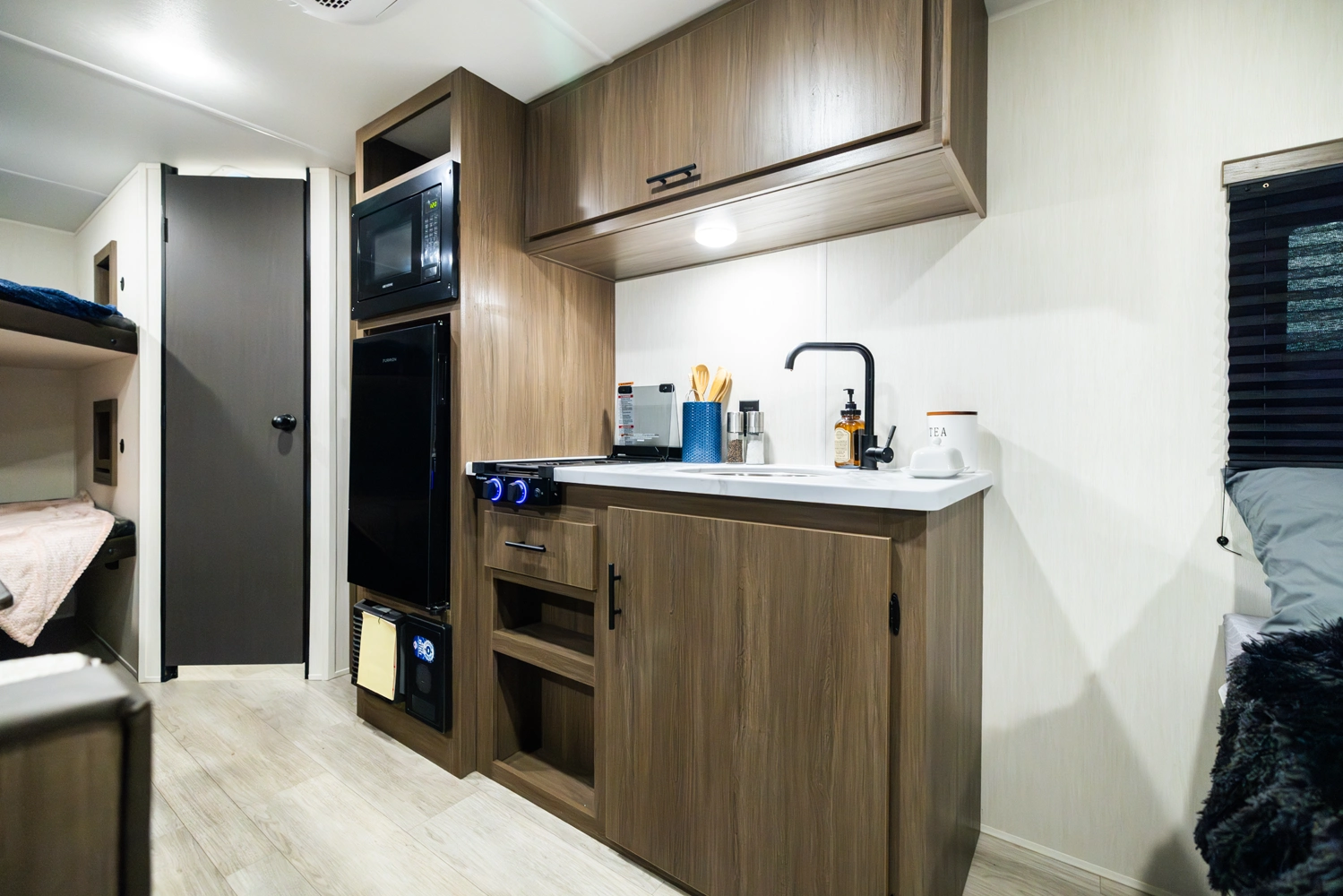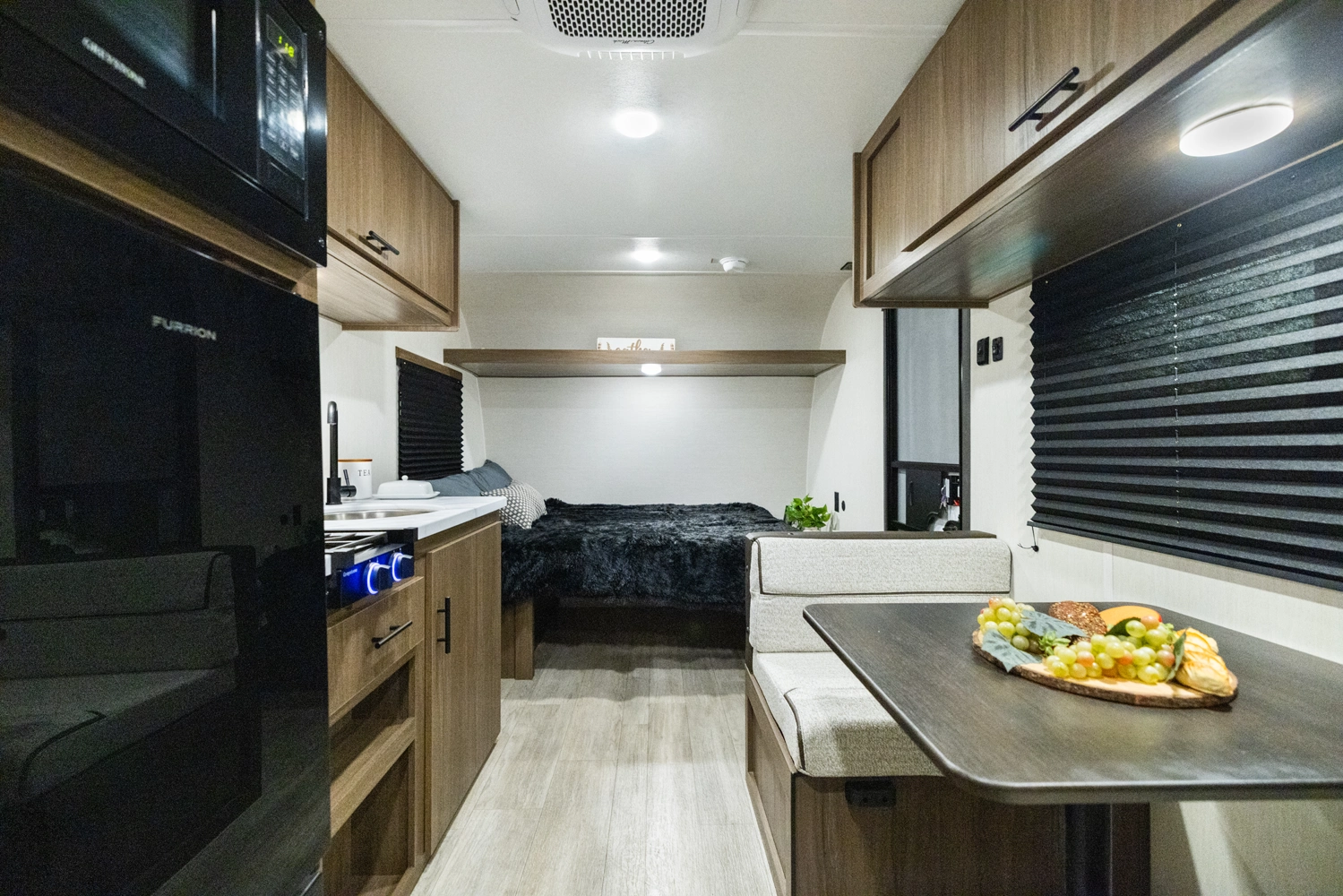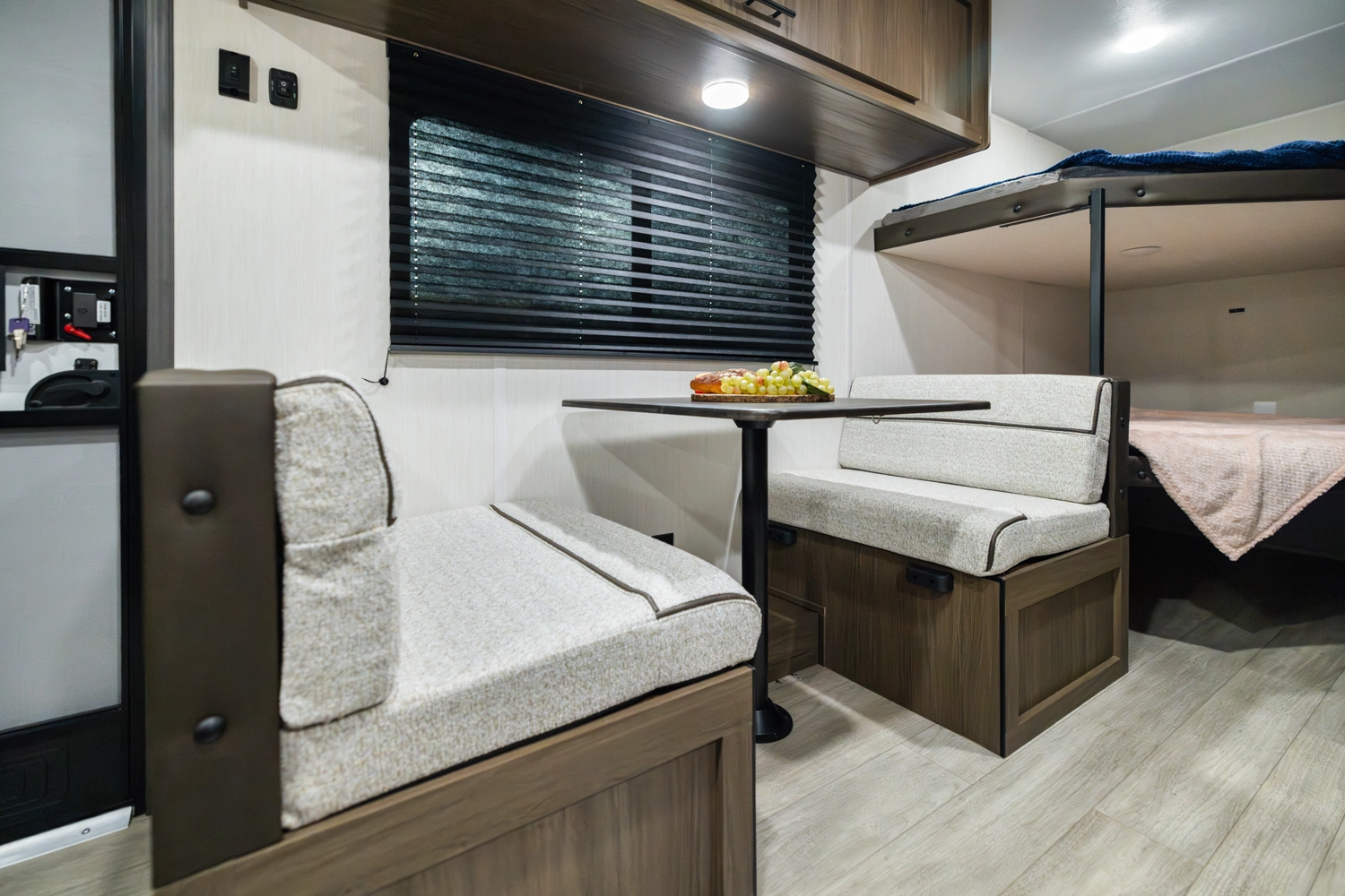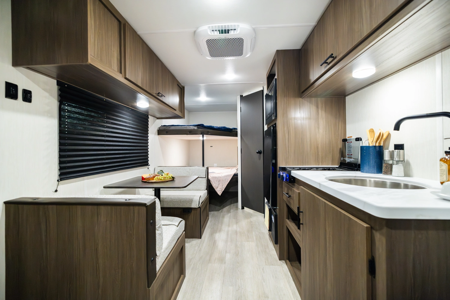 The 17DBX is packed with features. The Camp queen bed up front features a nightstand and shelf above. The kitchen provides a booth dinette, large farmhouse stainless steel sink, and modern appliances, while the rear bunkhouse gives you large double over double bunks for additional flexibility and comfort.