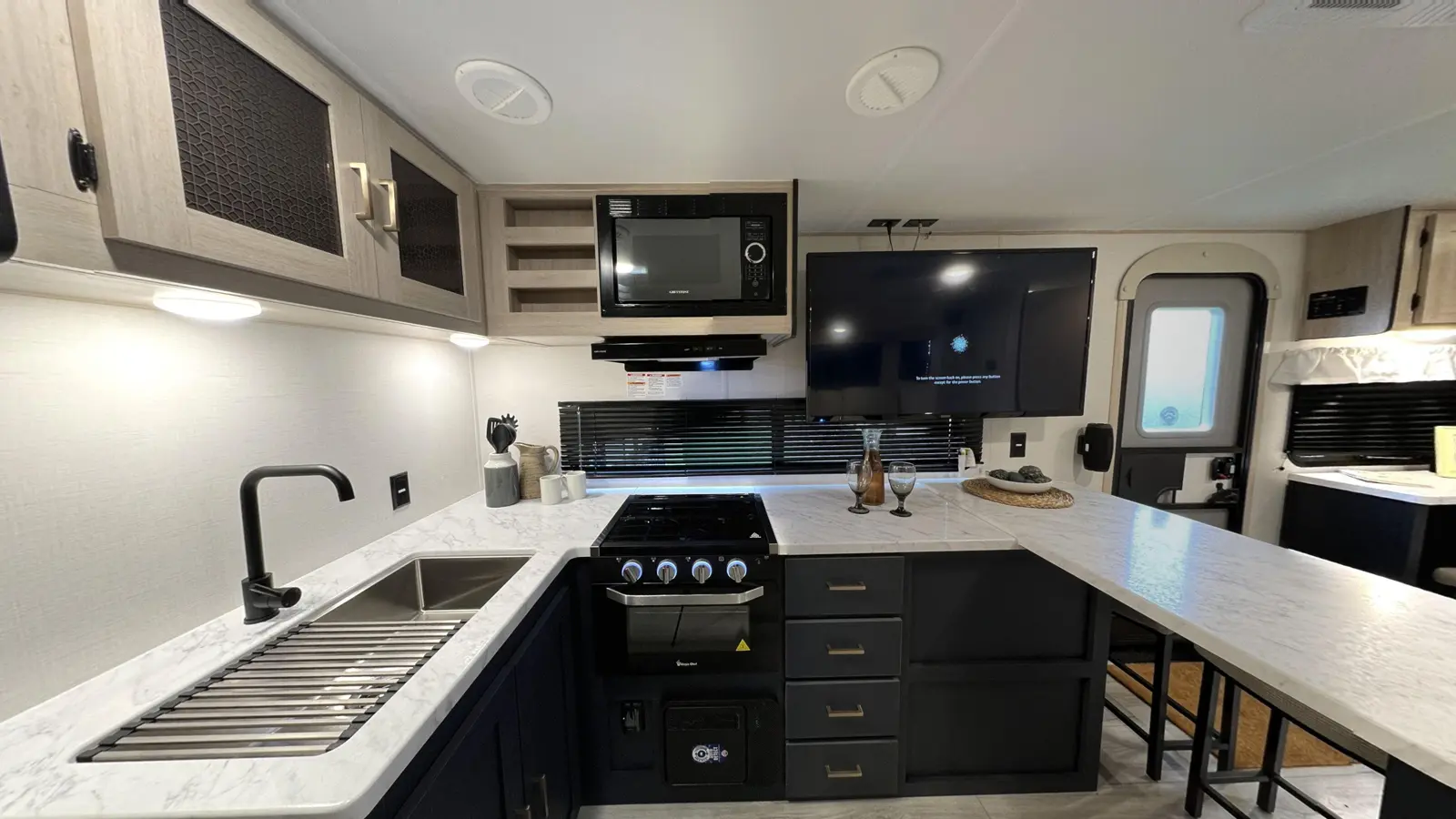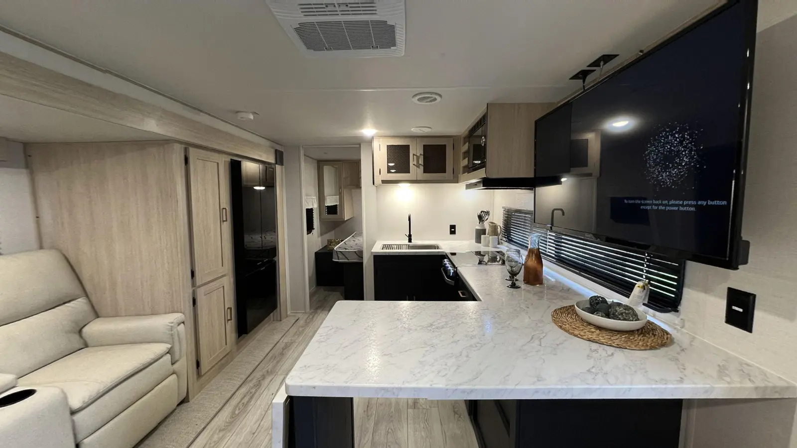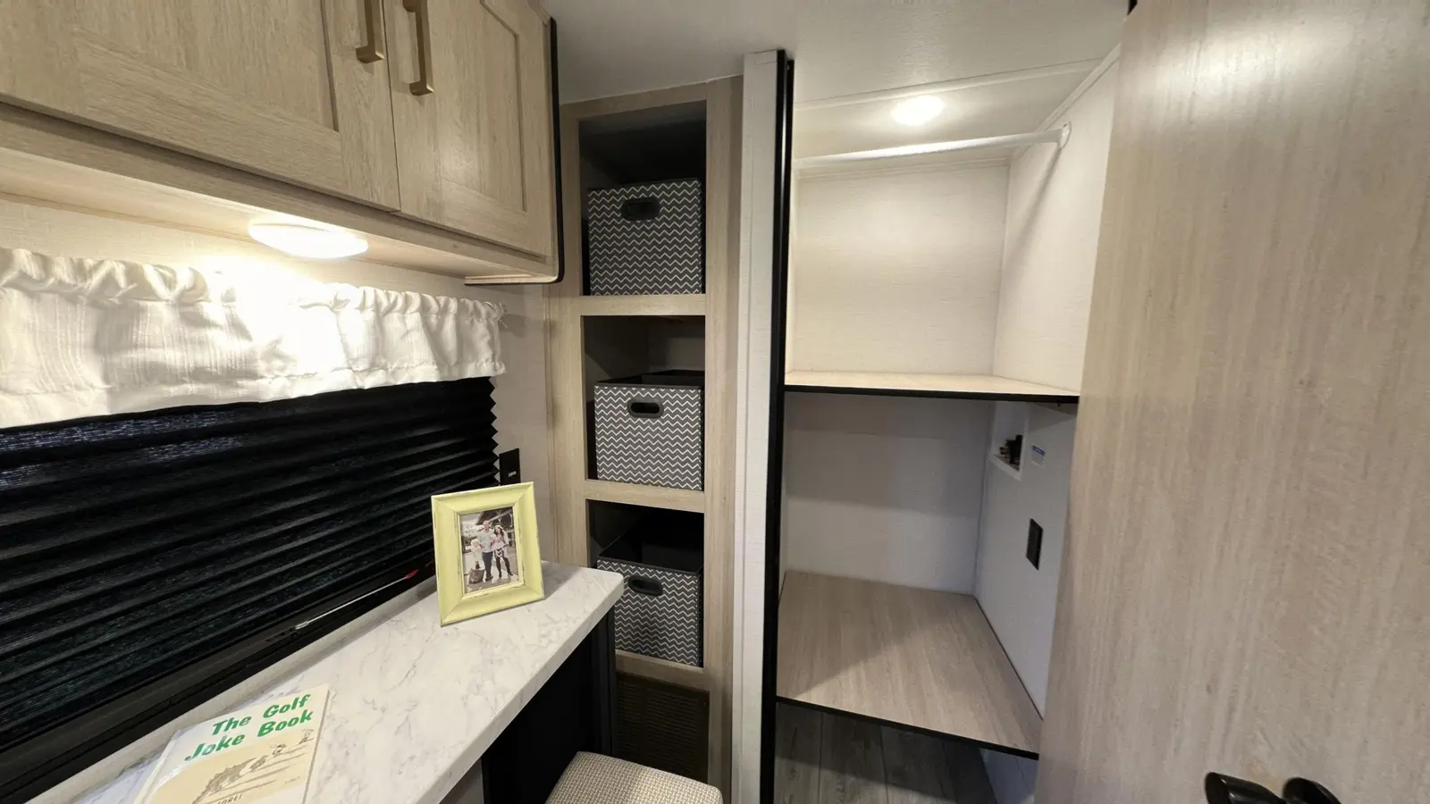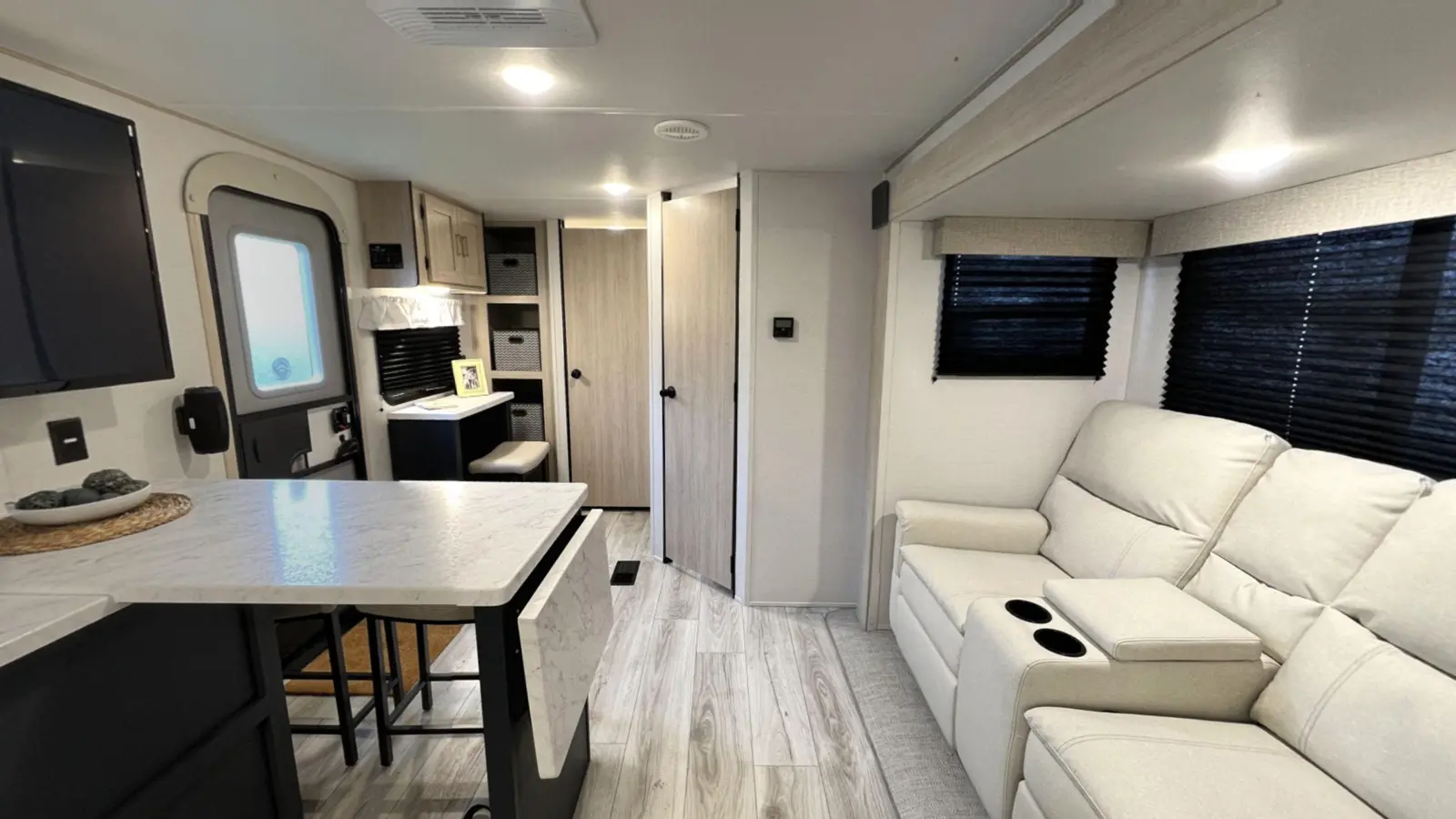 Looking for a travel trailer with unique features? The Avenger 25MKO by Forest River offers washer/dryer prep (under 30ft!) and a built-in desk, perfect for remote work. The spacious kitchen includes bar-style seating for extra counter space, 12-volt refrigerator and a full pantry. A must-see in the entry-level category!