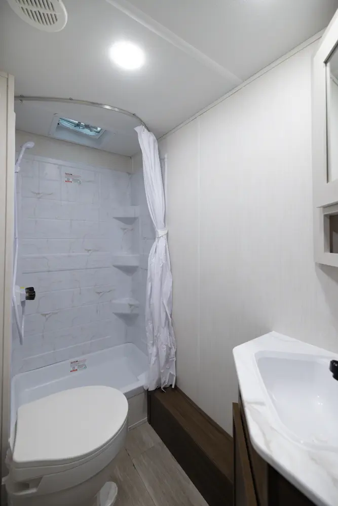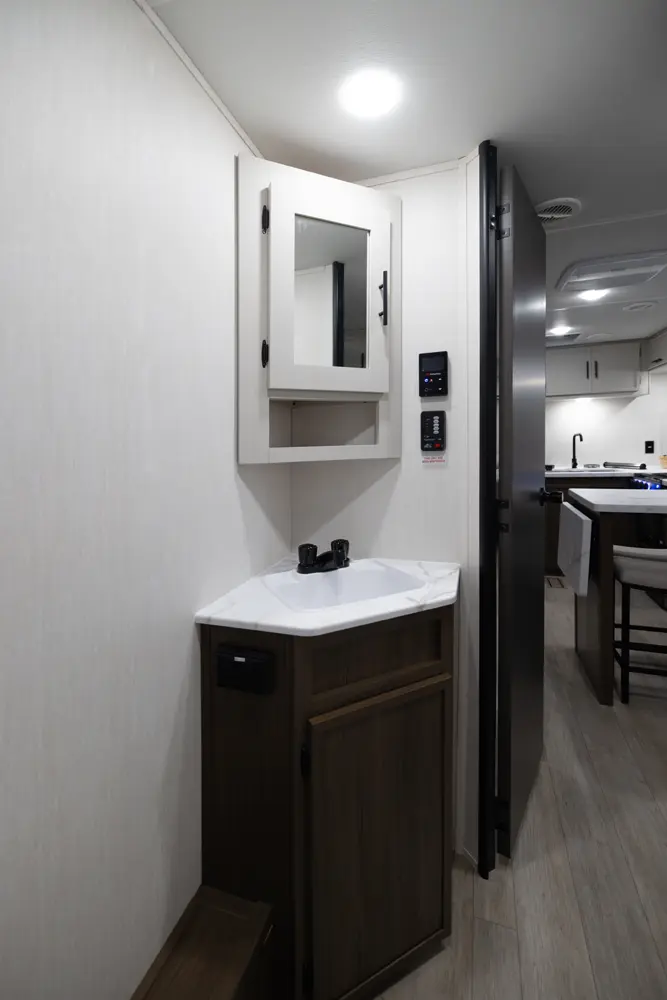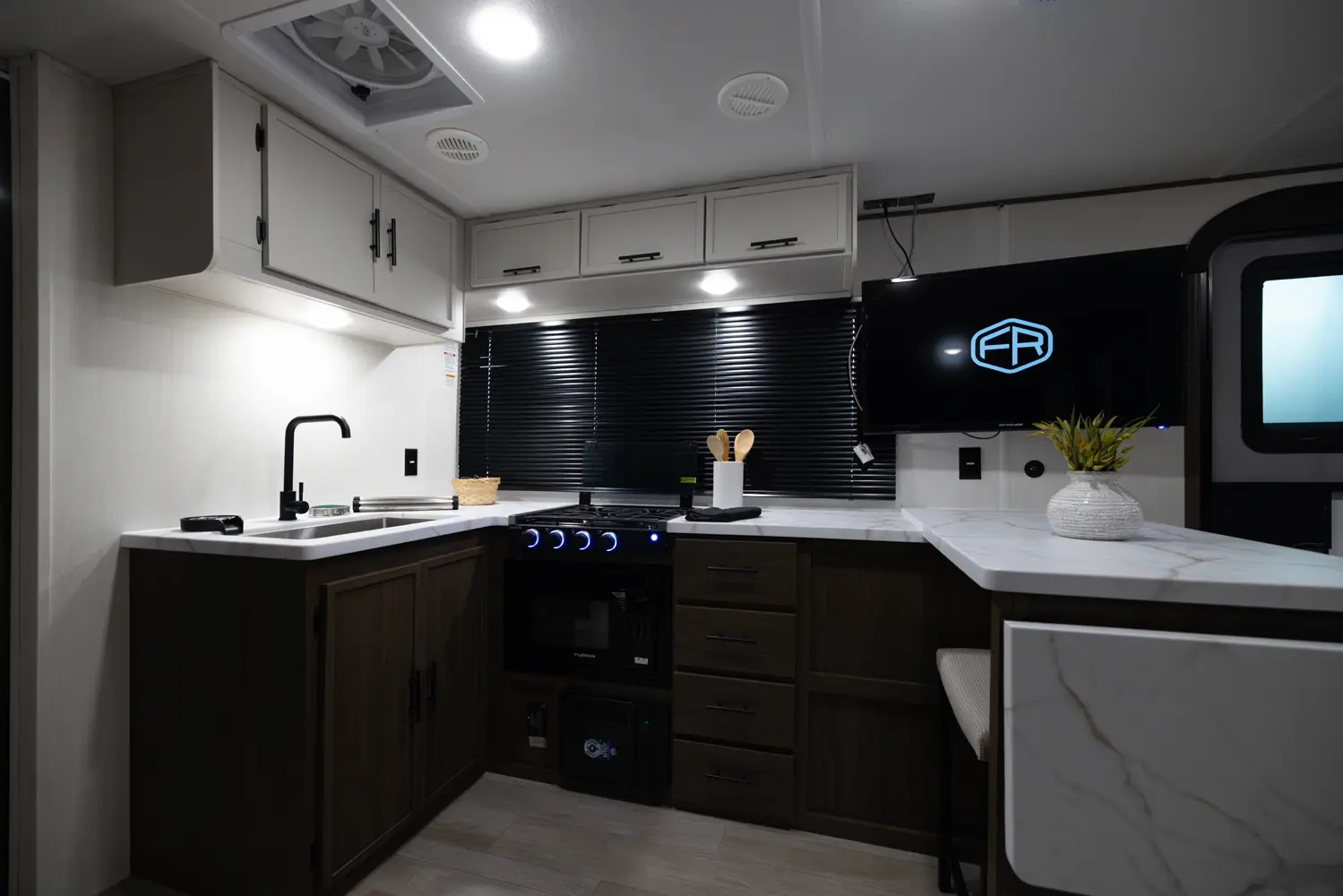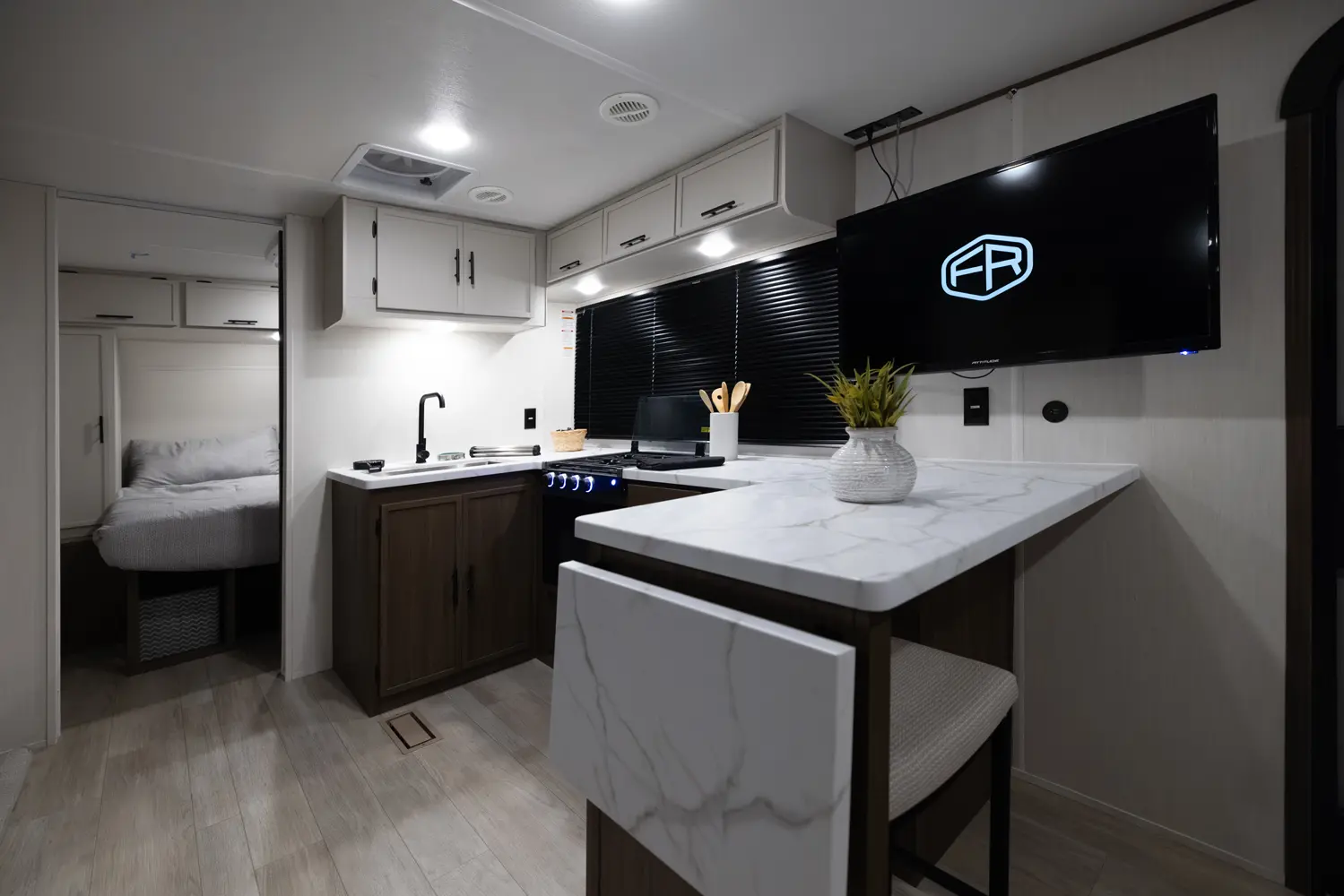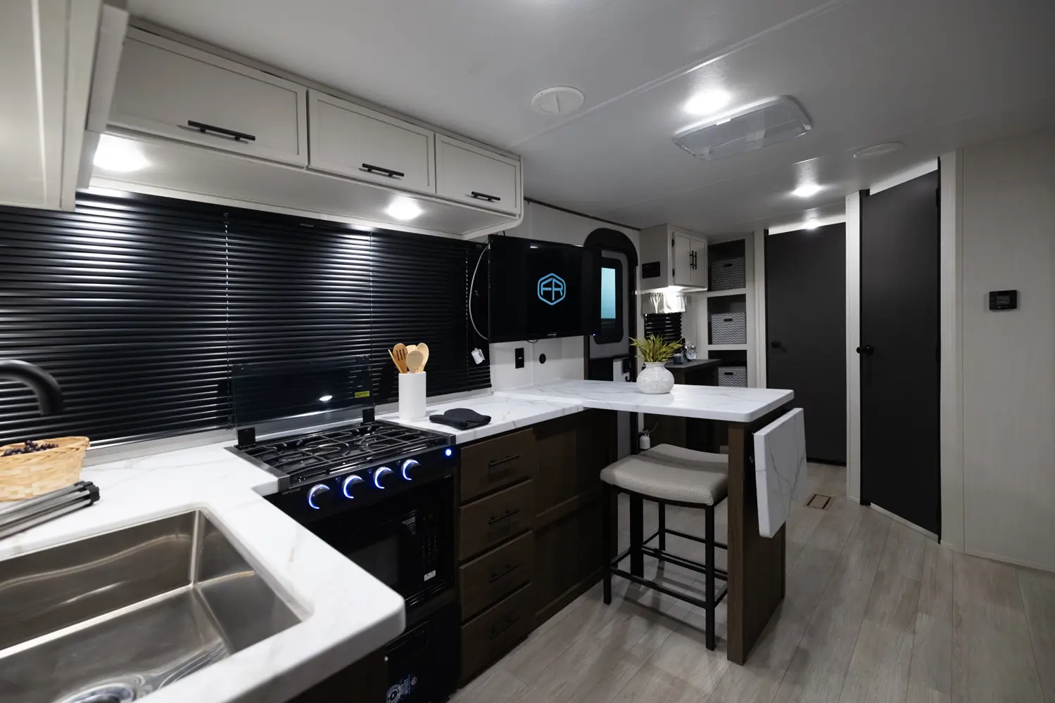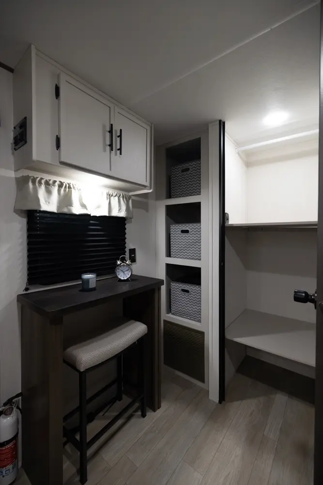 Looking for a travel trailer with unique features? The Avenger 25MKO by Forest River offers washer/dryer prep (under 30ft!) and a built-in desk, perfect for remote work. The spacious kitchen includes bar-style seating for extra counter space, 12-volt refrigerator and a full pantry. A must-see in the entry-level category!