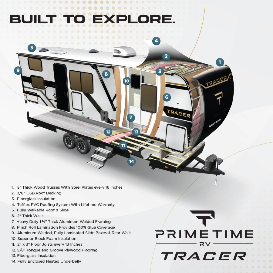 For the one who is looking for ultra-light weights, but doesn’t want to sacrifice interior space, amenities, and comfort. Tracer offers spacious layouts, plush residential style furniture and other high-end features not typically seen in an ultra-lite trailer! The Tracer has raised the bar for comfort and luxury in an ultra-lite brand. In your next travel trailer, make NO SACRIFICES!