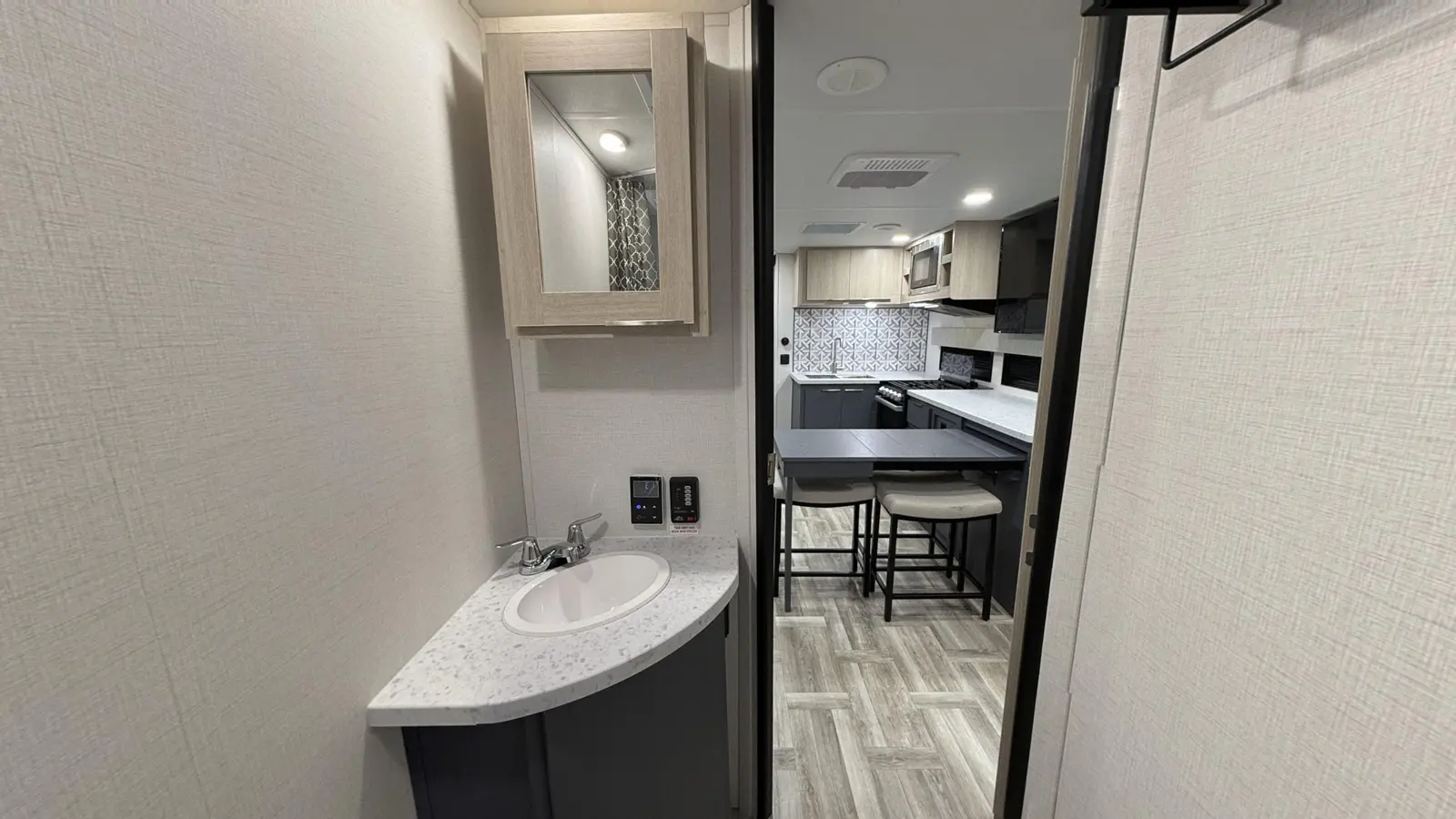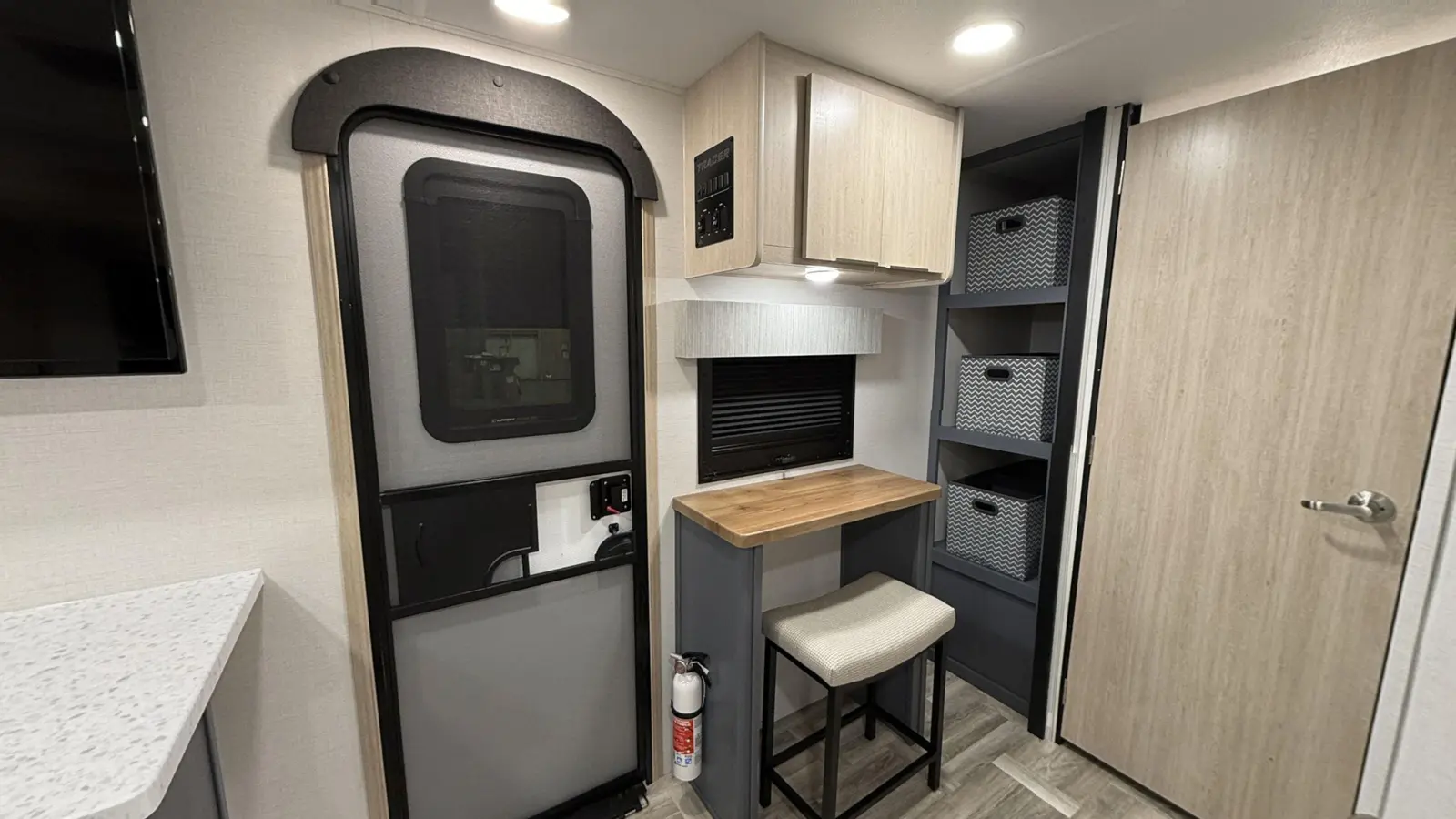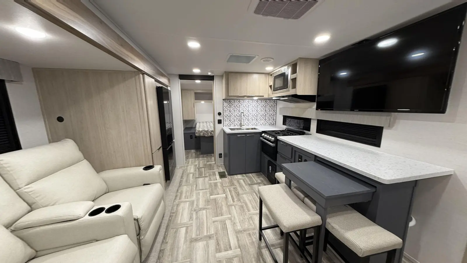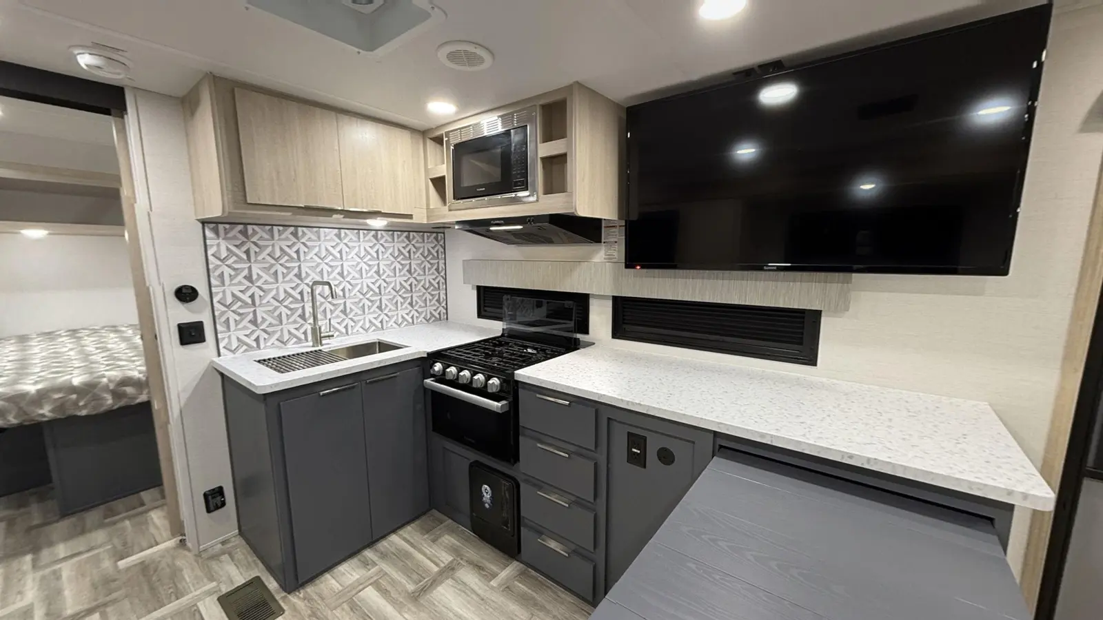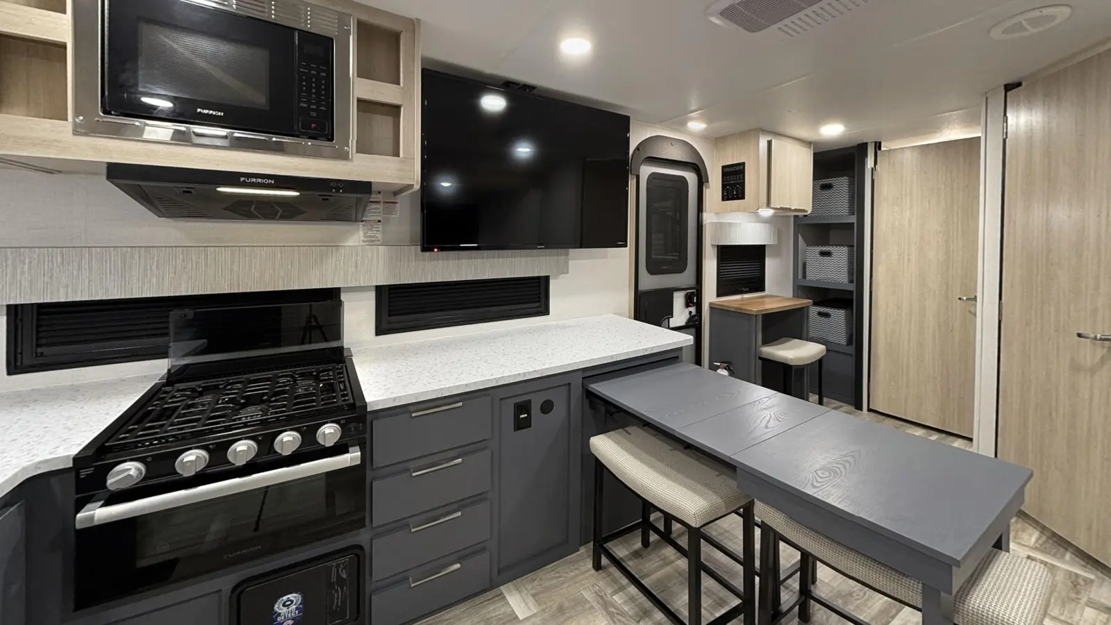 The Tracer 255DS is a unique and compact option for couples and solo campers alike. The modular design of the kitchen dinette allows for it to expand into more countertop space or seating for 4. You also get washer/dryer prep and a desk in a package under 30 ft!
