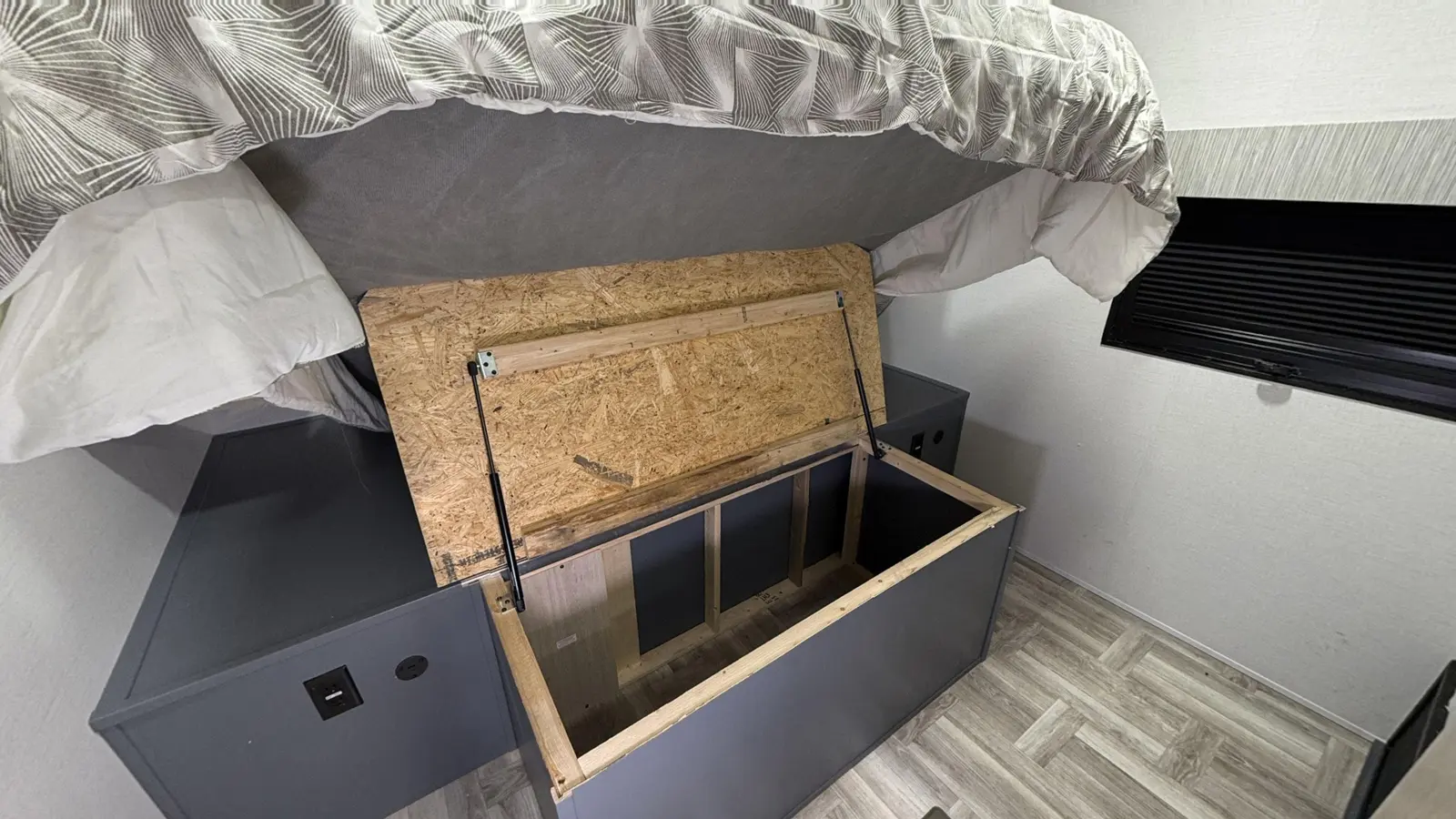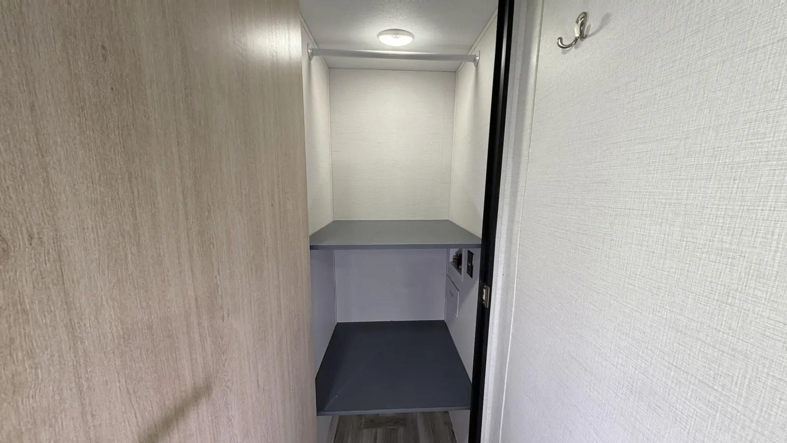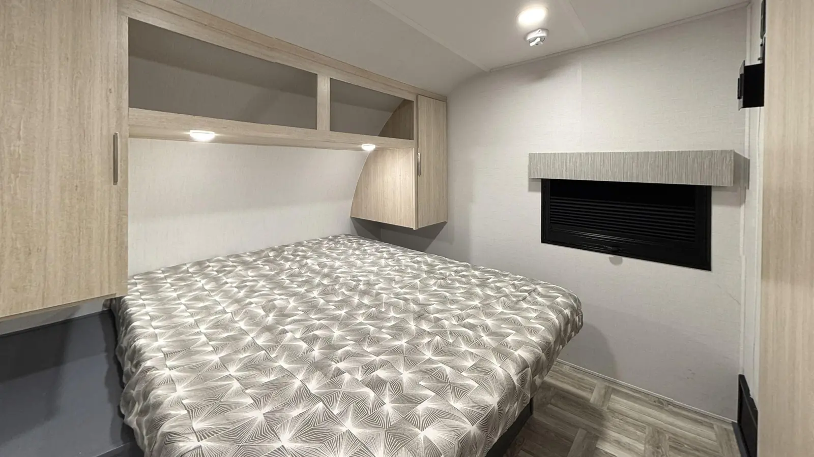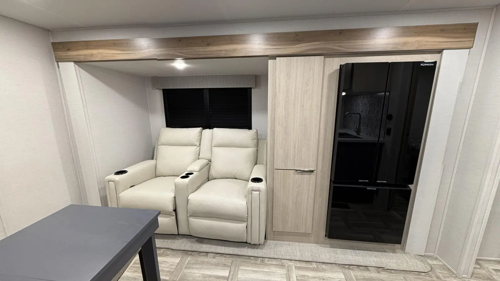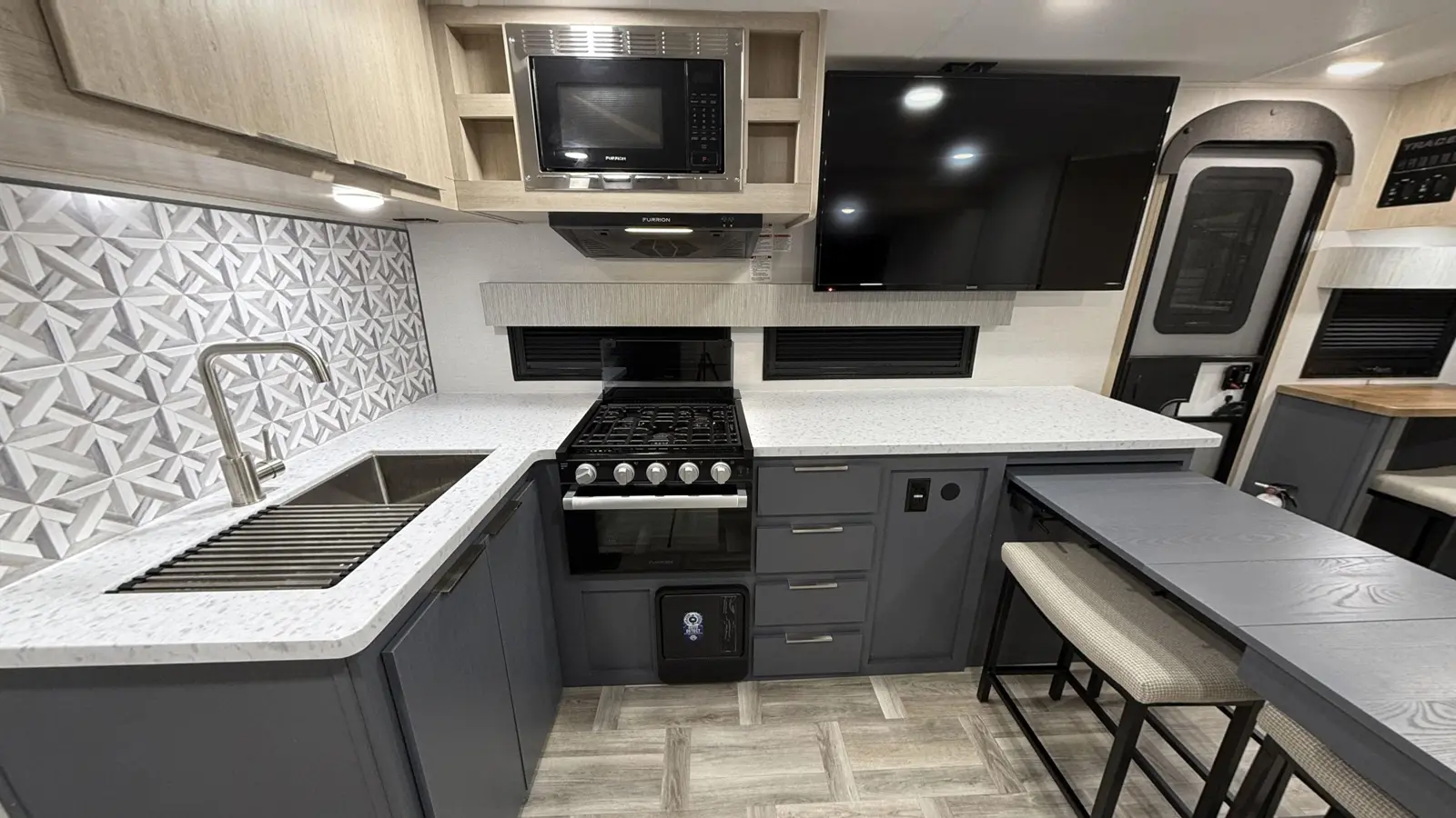 The Tracer 255DS is a unique and compact option for couples and solo campers alike. The modular design of the kitchen dinette allows for it to expand into more countertop space or seating for 4. You also get washer/dryer prep and a desk in a package under 30 ft!